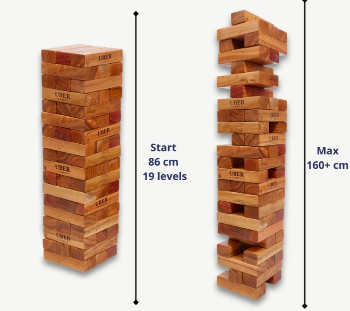 Pak om de beurt een blok uit één van de lagen en leg het boven op de toren. Zo kan de toren een hoogte van meer dan 160 cm bereiken. Als de toren valt, verlies je.